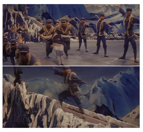 《紅軍不怕遠(yuǎn)征難》作為《中國革命之歌》中長征主題片段,突破了單一形式局限,融合演唱、交響樂、舞蹈、布景、光影、朗誦與歷史影像,打造出立體視聽效果。作品在宏大敘事中加入戰(zhàn)士互助、風(fēng)雪行軍等細(xì)膩細(xì)節(jié),強(qiáng)化人物情感與精神刻畫,打破傳統(tǒng)敘事框架,為平衡歷史真實與藝術(shù)審美提供了獨特范本。