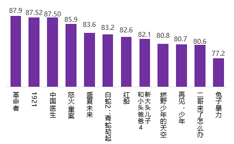 調(diào)查顯示,《革命者》《1921》《中國(guó)醫(yī)生》三部影片的滿意度得分分別為87.9分、87.52分、87.50分,分列2021年暑期檔影片滿意度排序的前三位。動(dòng)作片《怒火·重案》、青春片《盛夏未來(lái)》和動(dòng)畫(huà)片《白蛇2:青蛇劫起》滿意度居檔期第4至6位。