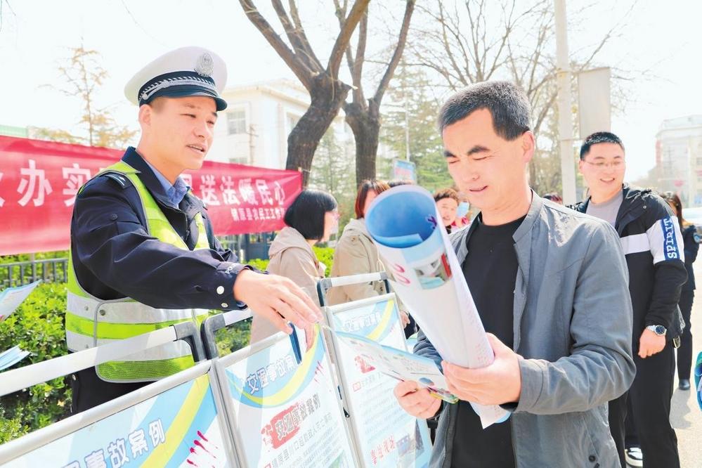 民警給過路群眾發(fā)放宣傳資料。4月8日,鎮(zhèn)原縣公安局交警大隊開展“春風送法暖民心”主題宣傳活動。新甘肅·甘肅法治報記者馬志國攝