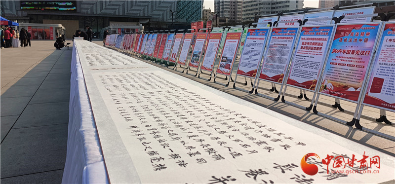 活動(dòng)現(xiàn)場(chǎng),省委宣傳部、省委政法委、省法院、省檢察院等20余家單位結(jié)合行業(yè)實(shí)際,宣傳憲法,普及法律知識(shí),為群眾提供法律咨詢。為了豐富普法載體,讓群眾在互動(dòng)參與中學(xué)習(xí)法律知識(shí),活動(dòng)展出了由定西市通渭縣司法局聯(lián)合書法家、師生群體、法官、檢察官、公安民警等各行各業(yè)工作人員創(chuàng)作的百米《書·法》長(zhǎng)卷,鐫刻法治精神,書寫法律法規(guī)。現(xiàn)場(chǎng)還表演了精彩的文藝節(jié)目。