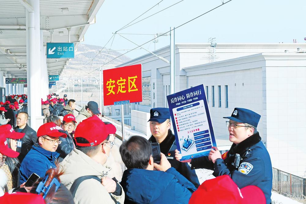 記者了解到,這批務(wù)工人員來自定西市各縣區(qū),既有返崗務(wù)工人員,也有新聘務(wù)工人員。為保障此次高鐵務(wù)工專列順利開行,蘭州鐵路公安處定西北站派出所積極與定西北車站、客運(yùn)部門通聯(lián),專門開辟“綠色通道”,暢通進(jìn)站、安檢、檢票等進(jìn)站環(huán)節(jié),劃定專門候車進(jìn)站區(qū)域,同時(shí)增派警力逐一引導(dǎo)務(wù)工人員有序進(jìn)站,幫助提拿大件行李、講解防范電信詐騙小妙招,用心用情保障務(wù)工旅客乘車安全。