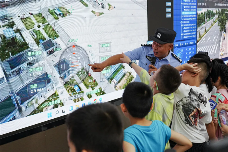 帶著興奮和期待,小朋友們的警營探索之旅開始了!在奧體中心警務(wù)站和警航作戰(zhàn)單元,他們沉浸式參觀了現(xiàn)代警務(wù)工作和警用無人機的指揮調(diào)度,直觀了解了公安工作的日常場景。另一邊,小朋友們在民警的指導(dǎo)下,一個個親手拿著警用武器裝備零距離“拍照打卡”,“這個好酷!”“看我的!”小朋友們的驚嘆聲此起彼伏。
