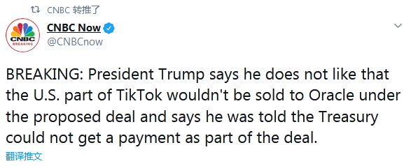 【環(huán)球網(wǎng)快訊】據(jù)CNBC剛剛消息,美國總統(tǒng)特朗普在16日的白宮新聞?dòng)浾邥?huì)上稱,他不喜歡目前甲骨文與TikTok目前擬定的合作協(xié)議,原因是TikTok的美國業(yè)務(wù)不會(huì)出售給甲骨文,而且他還被告知,美國財(cái)政部將無法從這次交易中拿到補(bǔ)償。