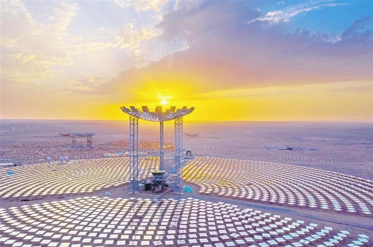 一排排風(fēng)電機(jī)組整齊列陣迎風(fēng)旋轉(zhuǎn),蔚然壯觀;成片的光伏板將茫茫戈壁裝點(diǎn)成浩瀚的藍(lán)色海洋,熠熠生輝;上萬塊定日鏡和吸熱塔構(gòu)成超級鏡子發(fā)電站,耀眼且震撼。