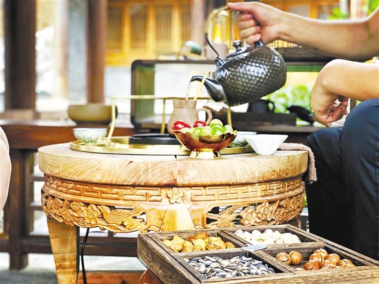 晚飯后是上座活躍期,一撥撥客人或隨意落座在古色古香的四合院長廊間,或穿堂入室端坐里間,聊天打趣侃侃而談,“搗”茶品茗各取所好,一天的疲乏與負(fù)累不知不覺間隨著那一刻輕溫慢煮的好時(shí)光,消散殆盡。