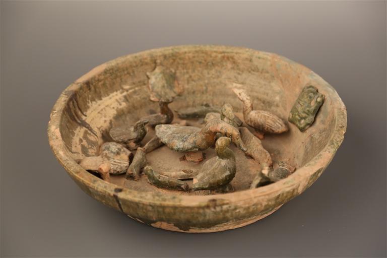 綠釉陶陂池高15厘米,口32厘米,底16厘米,為蘭州市博物館館藏三級(jí)文物。陶陂池內(nèi)有形象生動(dòng)的鴨、鵝、龜、青蛙等造型,代表墓主人生前擁有這樣一份家產(chǎn)。陂池,指在自然坡地筑堤蓄水澆灌農(nóng)田的池塘、澤沼。我國(guó)興修陂池的歷史很早,傳說(shuō)夏禹治水時(shí),曾從事“陂九澤”的工程。利用地勢(shì)蓄水灌溉,在古代較為普遍,尤其在漢代時(shí)陂池工程得到較大發(fā)展。陂池養(yǎng)魚、家禽、種藕、種菱角、養(yǎng)龜,不僅可提高農(nóng)民的經(jīng)濟(jì)收入,豐富人們的食物來(lái)源,還可以起到美化環(huán)境、凈化水質(zhì)的作用,青蛙、田螺自由生存,起到平衡自然生態(tài)的作用。