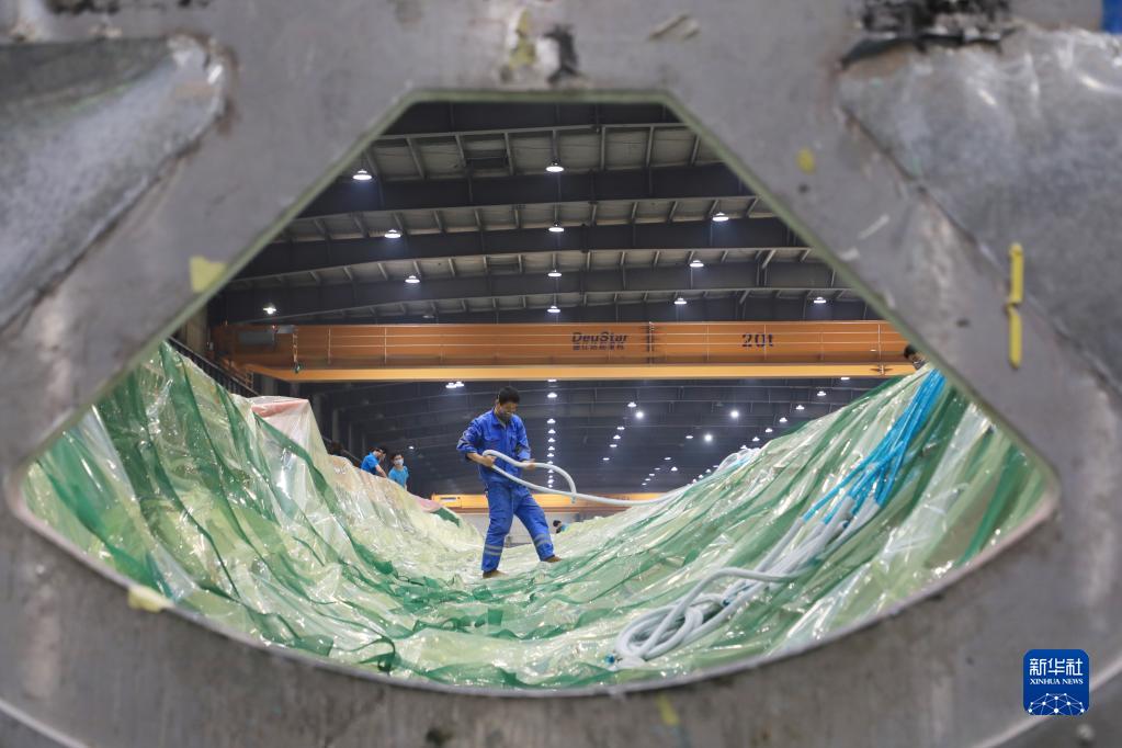 2月17日,在酒泉經(jīng)濟(jì)技術(shù)開發(fā)區(qū)的一家風(fēng)電葉片制造企業(yè),工人在風(fēng)機(jī)葉片生產(chǎn)線為葉片灌注做準(zhǔn)備。