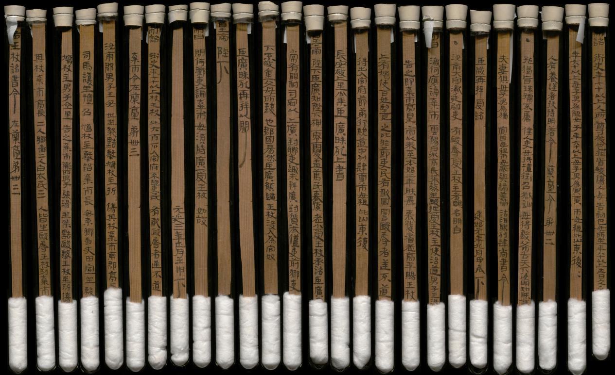 1959年,在武威市涼州區(qū)新華鄉(xiāng)磨嘴子第18號墓中,出土木簡10枚,出土時懸掛于一鳩杖之上。其內容記載了東漢永平十五年(72年)幼伯受王杖事,并錄建始二年(前31年)九月“年七十受王杖”的詔書和和平元年(前28年)毆擊王杖主當棄市的令。由于簡上無編號,出土時次序已亂,史學界稱其為“王杖十簡”。簡長23.2-23.3厘米,寬1厘米,共有240字。松木削制、兩道編繩、先書后編、墨書隸體、字跡清晰。