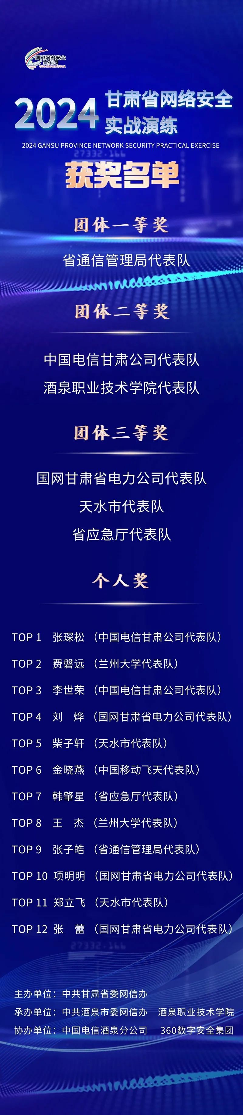 6月14日,2024年甘肅省網(wǎng)絡安全實戰(zhàn)演練在酒泉圓滿落下帷幕。來自全省各地、關(guān)鍵信息基礎(chǔ)設(shè)施保護部門、關(guān)鍵信息基礎(chǔ)設(shè)施運營單位、省內(nèi)高校、國有企業(yè)、銀行、部隊等領(lǐng)域的60支代表隊180名參演選手經(jīng)過激烈角逐,最終產(chǎn)生團體賽一等獎1個、二等獎2個、三等獎3個,個人獎12個。