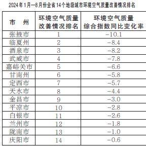 2024年1月—8月份,全省14個地級城市環(huán)境空氣質(zhì)量改善情況排名由好到差分別為:張掖市、臨夏州、酒泉市、武威市、嘉峪關(guān)市、甘南州、定西市、天水市、金昌市、平?jīng)鍪?、白銀市、蘭州市、隴南市、慶陽市。