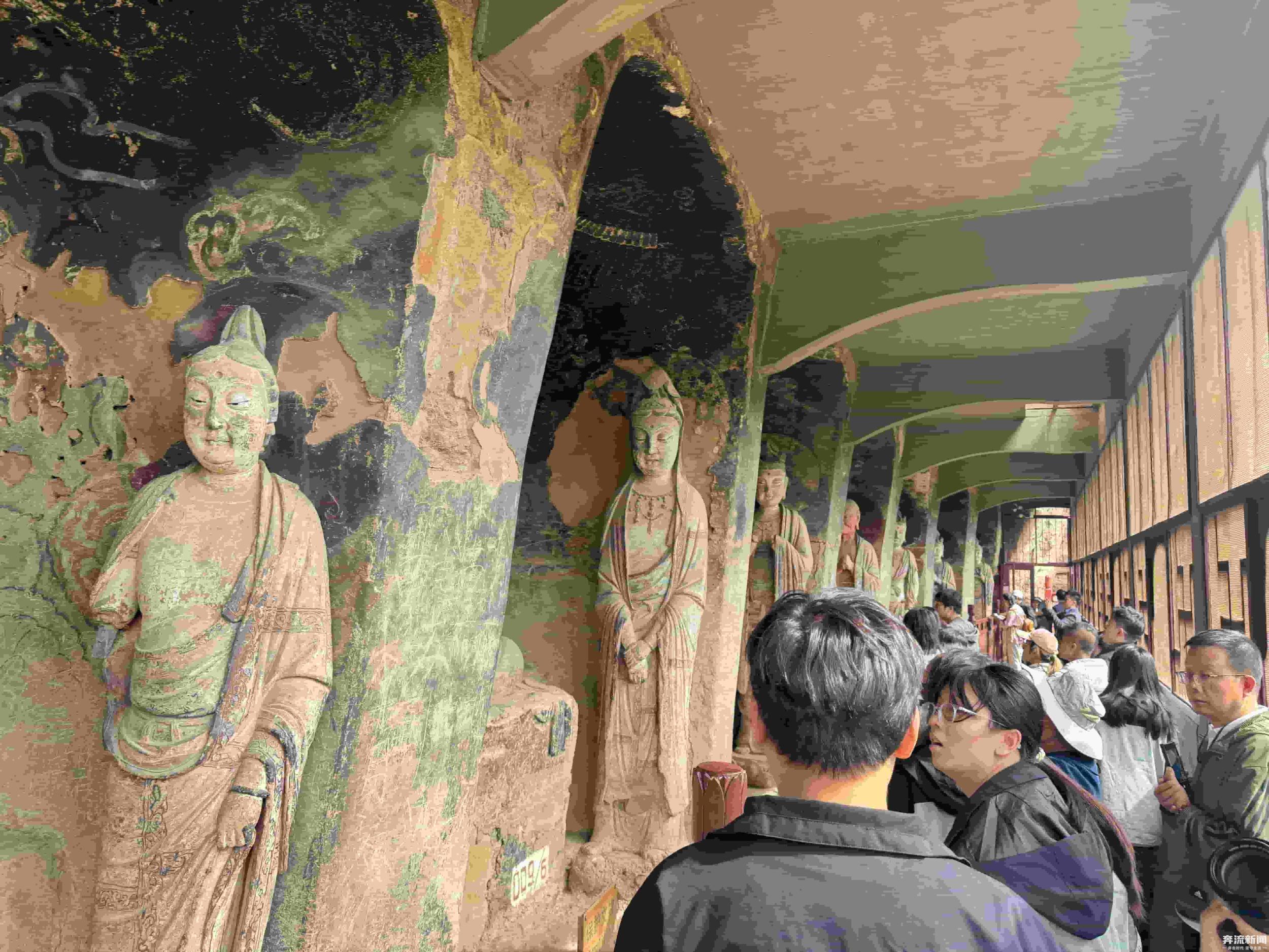 沿著凌空架設(shè)的棧道蜿蜒而上,仿若攀緣九霄云端。千姿百態(tài)的造像、總面積約1000平方米的壁畫(huà)以及精雕細(xì)琢的仿木崖閣建筑等文物遺跡依次呈現(xiàn)在眼前。