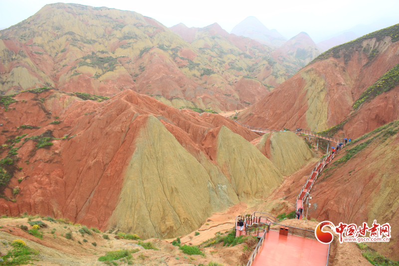 游客們乘坐觀光車沿途游覽,絲路霞光、九色丹青、丹頂攬勝等7個(gè)觀景平臺(tái)各具特色,山體色彩斑斕、紋理交錯(cuò),雨后更如水墨畫般淡雅別致,與北宋《千里江山圖》、元代《富春山居圖》的意境神似。