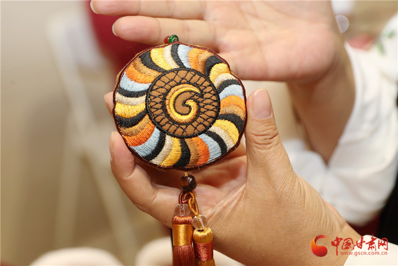 真正讓她想“給香包加點新東西”,是一次省博看展的觸動。站在馬家窯彩陶罐前,她盯著罐身流轉(zhuǎn)的旋渦紋出了神:“這么好看的紋路,繡在香包上多妙?”后來去敦煌,莫高窟里飛天的飄帶、藻井的繁復花紋更讓她挪不開腳?;貋淼穆飞?,一個念頭愈發(fā)清晰:要讓博物館里的文物“活”在香包里,讓老手藝沾染上“文化氣”。