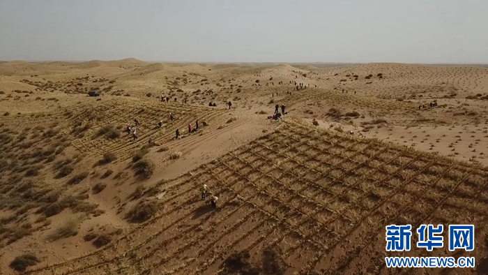 圖為甘肅省武威市古浪縣八步沙林場在扎草方格壓沙(資料圖片)。新華網(wǎng)發(fā)(童張偉 攝)