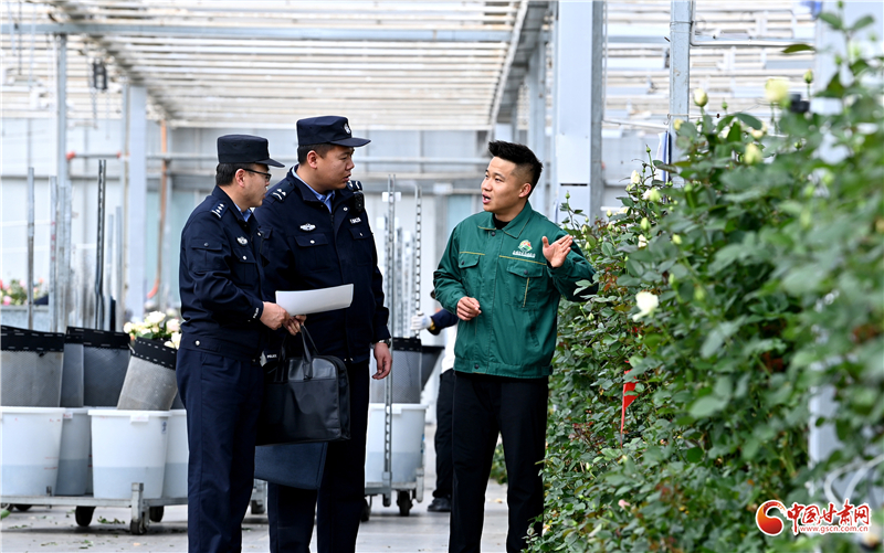 圖為紅古分局花莊派出所民輔警在蘭州一家農(nóng)企的多肉種植基地宣傳安全生產(chǎn)知識