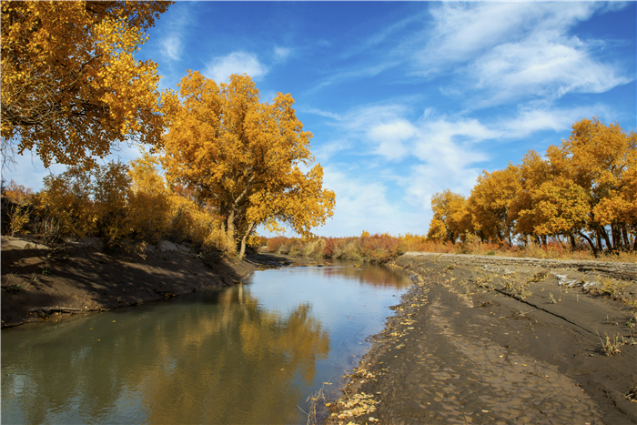 望桿傲立胡楊樹(shù),逾萬(wàn)年難腐??村\繡金黃,彩袂飄飄,持練當(dāng)空舞。