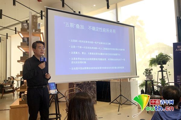 《智能經(jīng)濟(jì)》新書研討會(huì)上,張曉峰在進(jìn)行主題演講。中國(guó)青年網(wǎng)記者 張?jiān)姮?nbsp;攝