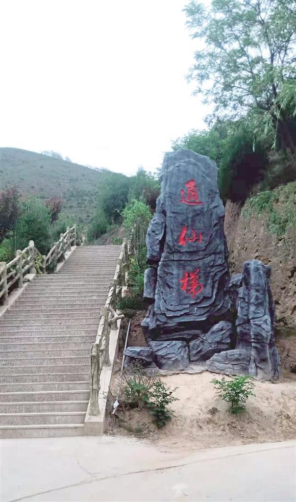 一條羊腸小道蜿蜒了千年,承載了無數(shù)游覽者匆匆的步履,在人們無數(shù)次的暢想中,化成了一條金光大道,讓老人、孩童和物資可直達(dá)寺窟門外。醒目的“通仙梯”石刻指引人們沿著游步道拾級(jí)而上,領(lǐng)略綠樹掩映、曲徑通幽的絕好勝景,金黃的葉子在濃密的綠葉間格外鮮亮,松樹和柏樹你擠著我,我挨著你,密密匝匝,在五月的陽光和微風(fēng)中,吟唱著生命的贊歌。白色槐花香氣馥郁,紅色槐花鮮艷奪目,它們從高高的枝頭垂下來,或從山崖斜伸而出,或與游人摩肩而過,或者親呢的撫摸一下游人的笑臉。掩映綠樹中的亭子,是一道絕好的景觀,讓人產(chǎn)生一種遐想和逗留的念想。亭子旁叫不出名的小鳥輕盈的飛舞和歡快的鳴叫,增添了一種活潑美妙的情趣。這情趣給花樹、亭子帶來一種靈性,頻添了無限韻味和妙趣。