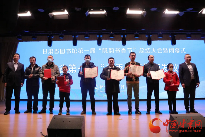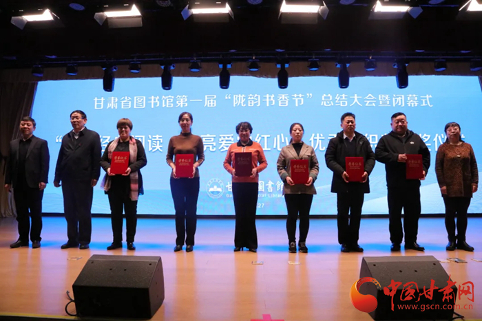 中國甘肅網(wǎng)12月28日訊(本網(wǎng)記者 張?zhí)m琴 通訊員 吳鵬)12月27日,歷時(shí)8個(gè)月的甘肅省圖書館第一屆隴韻書香節(jié)圓滿落幕。閉幕儀式上播放了第一屆“隴韻書香節(jié)”活動(dòng)總結(jié)短片和書香家庭宣傳短片,公布了“隴韻書香節(jié)”形象標(biāo)識(shí)(LOGO)方案,并為“甘肅省第一屆書香家庭”獲得者、“紅色經(jīng)典閱讀  點(diǎn)亮愛黨紅心”活動(dòng)獲獎(jiǎng)?wù)哳C獎(jiǎng)。