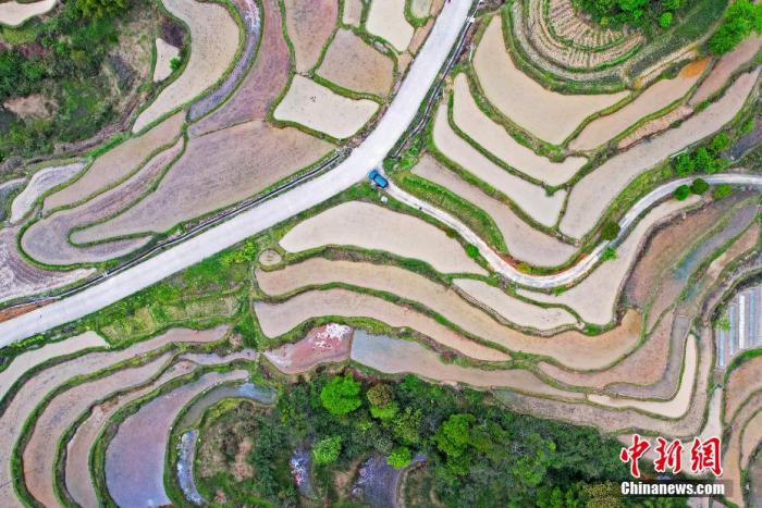 資料圖:春耕時(shí)節(jié)彎彎曲曲的梯田。 黃河 攝