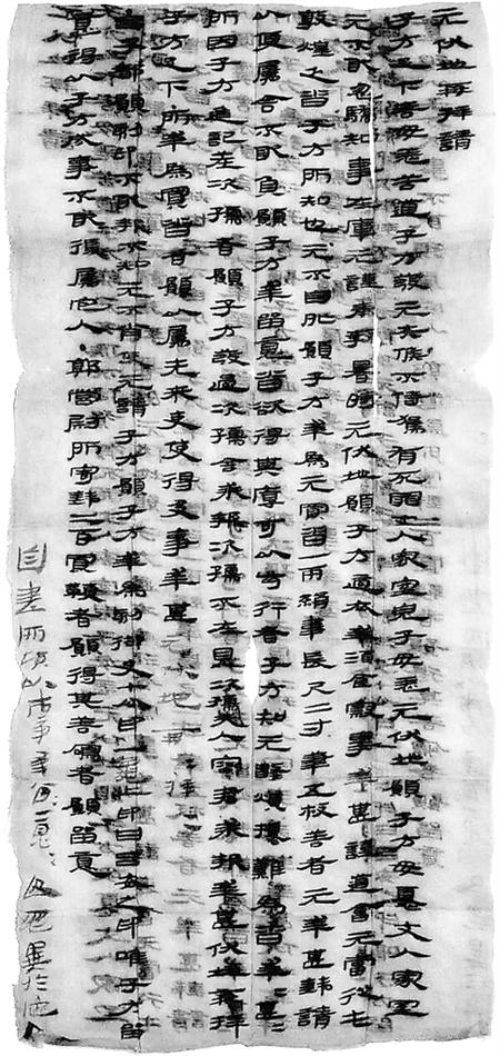 子方足下,善毋恙!苦道子方發(fā),元失候不侍駕,有死罪。丈人、家室、兒子毋恙,元伏地愿子方毋憂。丈人、家室元不敢忽驕,知事在庫(kù),元謹(jǐn)奉教。暑時(shí)元伏地愿子方適衣、幸酒食、察事,幸甚!謹(jǐn)?shù)溃簳?huì)元當(dāng)從屯敦煌,乏沓,子方所知也。元不自外,愿子方幸為元買沓一兩,絹?lái)f,長(zhǎng)尺二寸;筆五枚,善者,元幸甚。錢請(qǐng)以便屬舍,不敢負(fù)。愿子方幸留意,沓欲得其厚、可以步行者。子方知元數(shù)煩擾,難為沓。幸甚幸甚!所因子方進(jìn)記差次孺者,愿子方發(fā)過(guò)次孺舍,求報(bào)。次孺不在,見次孺夫人容君求報(bào),幸甚,伏地再拜子方足下!所幸為買沓者,愿以屬先來(lái)吏,使得及事,幸甚。元伏地再拜再拜!