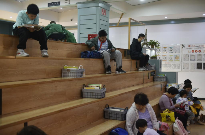 10月18日,小學(xué)生在鄭州市緯五路第一小學(xué)校園閱讀中心內(nèi)寫作業(yè)。