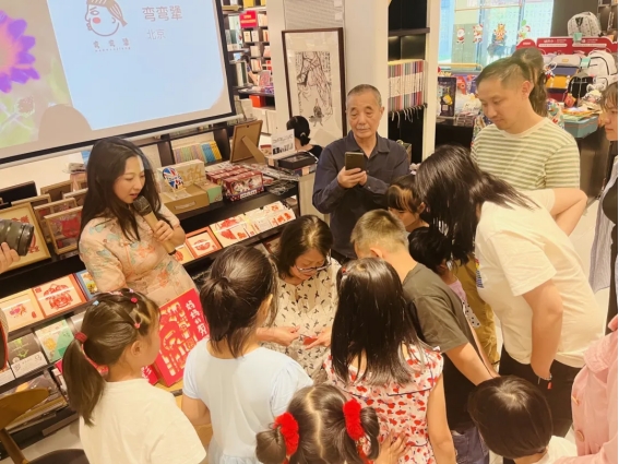 北京航空航天大學(xué)新媒體藝術(shù)與設(shè)計學(xué)院教授顏新元為作者獻花,并與劉雪純、彎彎以及小朋友們一起為“彎彎工作室”揭幕。