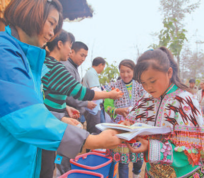 志愿者在為村民和孩子們發(fā)放圖書、文具等。張廣玉攝