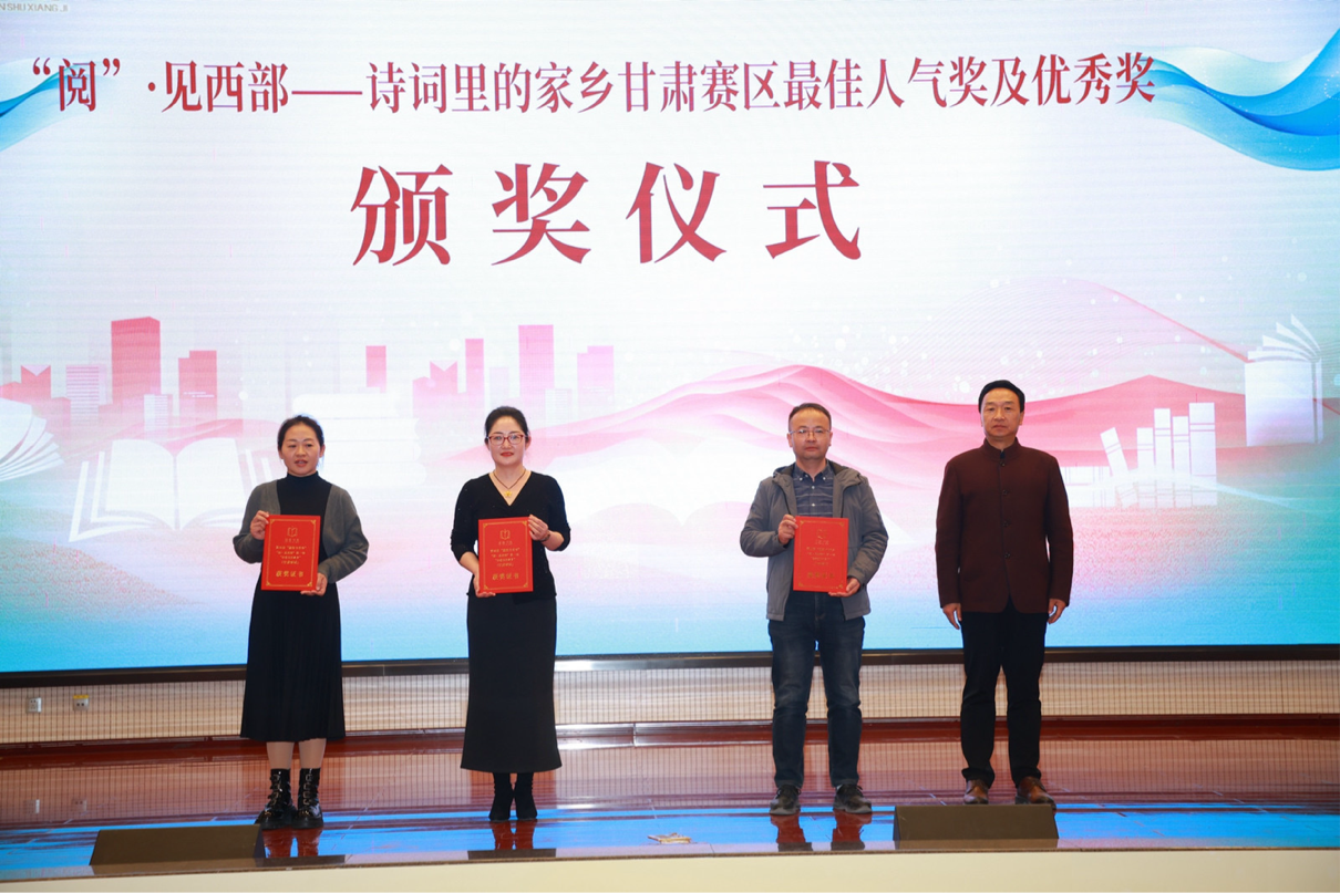 閉幕式上公布并表彰了“優(yōu)秀閱讀推廣活動(dòng)案例獎(jiǎng)”獲獎(jiǎng)人員、“‘穿越古今·夢(mèng)回隴右’詩詞大賽優(yōu)秀組織獎(jiǎng)”獲獎(jiǎng)人員、“‘閱·見西部’第一季——‘詩歌里的家鄉(xiāng)’(甘肅賽區(qū))最佳人氣獎(jiǎng)和優(yōu)秀獎(jiǎng)”獲獎(jiǎng)人員。