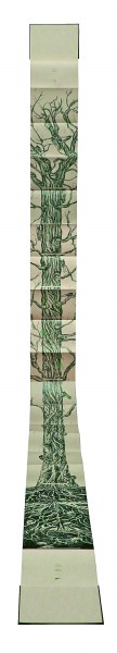 除了材料語(yǔ)言的拓展,展覽中的許多作品還展現(xiàn)出設(shè)計(jì)形式的創(chuàng)新與突破。如陳潔瑩的《蟬鳴樹(shù)語(yǔ)》聚焦了蟬絢爛而短暫的生命軌跡。書(shū)籍的裝幀方式采用經(jīng)折裝,當(dāng)書(shū)本徐徐展開(kāi),一棵參天古樹(shù)好似拔地而起,貫通全書(shū)首尾。由樹(shù)根處為起點(diǎn)向上閱讀直至樹(shù)冠,可見(jiàn)蟬從卵枝到若蟲(chóng),再經(jīng)歷脫殼變?yōu)槌上x(chóng)的歷程。經(jīng)由巧妙的形式設(shè)計(jì),生命的輪回在書(shū)頁(yè)間流轉(zhuǎn),詮釋出動(dòng)人的自然之力。