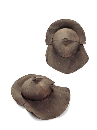 先看前加沿笠帽,大家看是不是有些眼熟?沒錯,這頂帽子與影視劇中英雄俠客們所戴的帽子很相似,《神探狄仁杰》里的李元芳、《水滸》中的林沖外出時就戴類似的帽子。為什么要戴這樣的加沿笠帽呢?為了遮光啊。別小瞧這頂前加沿笠帽,它的背后還有一段歷史故事呢:相傳元世祖忽必烈騎馬射獵時覺得日光太過炫目,聰慧體貼的皇后便為他設計了這種前面加沿的帽子,戴這種加沿帽遮光效果就好多了,忽必烈非常喜歡,便將這種式樣固定了下來,以后國人紛紛效仿,成為流行款式??墒牵扑问窃谠?,元芳和林沖似乎不該戴類似的帽子?既是藝術形象,就不用深究了吧。人類智慧相通,英雄更是惺惺相惜,既都是英雄,戴上同款的帽子也是應有之義。