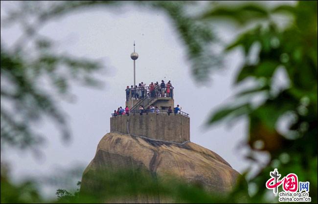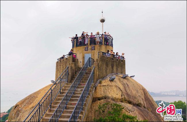 說到自然風(fēng)光,便不能不提日光巖——這島上的最高峰。日光巖別名“晃巖”,相傳1641年,鄭成功來(lái)到此地,見此地風(fēng)景勝過吉林日光山,便把“晃”字拆開,稱之為“日光巖”。要登臨此巖,一窺日光,便要辛勞走一段山路。其間渾圓的巨石層出不窮,蒼郁的古樹隨處可見,更有閩南大厝、名人題字與這些自然風(fēng)景相得益彰。于是游人往往在心曠神怡中,路過“九夏生寒”“鷺江龍窟”,經(jīng)由“閩海雄風(fēng)”“古避暑洞”,不知不覺間,來(lái)到巖頂?shù)钠脚_(tái)。立定此處,憑欄遠(yuǎn)望,只見輕靈的云天近在咫尺,島上的屋宇盡收眼簾——別提有多么愜意!難怪有詩(shī)人寫道:“一葉輕舟破霧霾,波濤滾滾此登臺(tái)。日光巖上憑欄望,隔岸清風(fēng)過海來(lái)。”(陳仁德句)