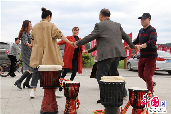 3月22日中午,湖南省隆回縣司門前鎮(zhèn)學(xué)堂灣村,文化志愿者教村民打手鼓、跳舞,吸引一旁踏青的游客前來觀摩。