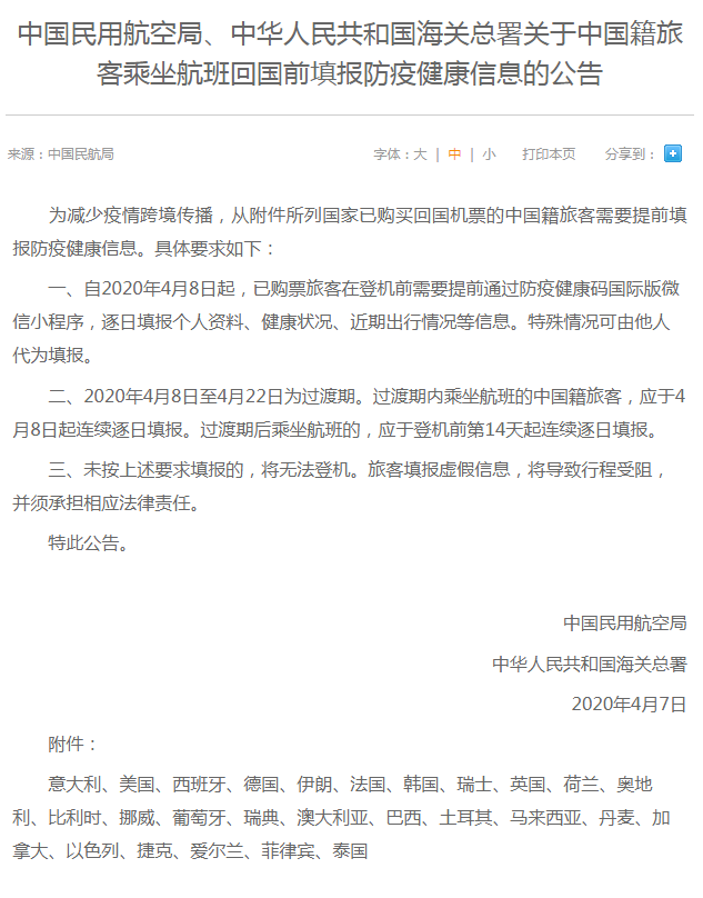 《公告》稱,過渡期間設(shè)定為2020年4月8日至2020年4月22日。過渡期內(nèi)乘坐航班的中國籍旅客,應于4月8日起連續(xù)逐日填報。過渡期后乘坐航班的,應于登機前第14天起連續(xù)逐日填報。