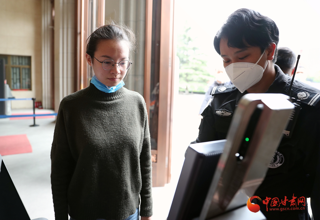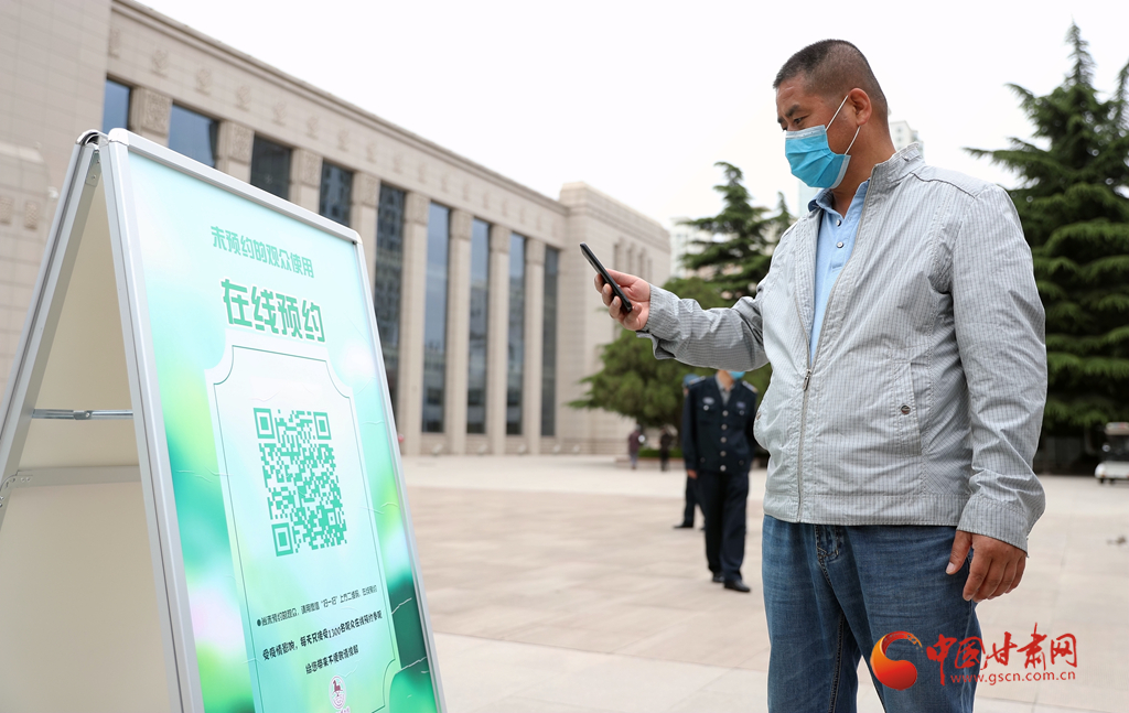5月8日,在甘肅省博物館入口,一位市民正在通過在線預約的方式入館參觀。