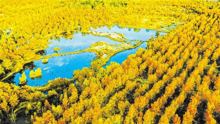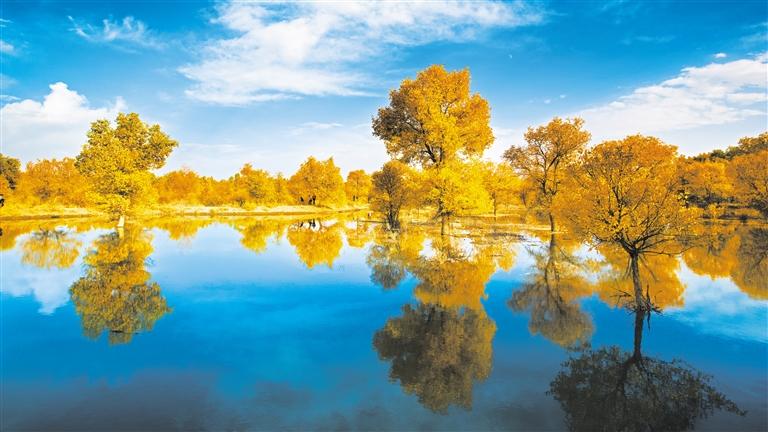 站在金波湖邊,滿目的赤橙黃綠與盈盈秋水互相映襯,胡楊金色的葉子倒映在潭水中,形成金色的水泊,微風掠過,層層漣漪漸漸擴大,最后消失在胡楊的倩影里,構(gòu)成一幅幅精美的油畫。烘托出一幅“碧云天、黃葉地、秋色連波、波上寒煙翠”的絕美妙油畫卷。