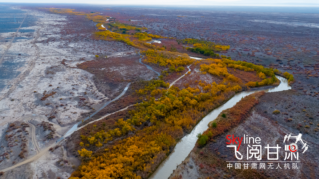 金秋十月,在疏勒河水的浸潤下,大片的胡楊金光閃爍,為古老的疏勒河古道繞上了一條金色的絲帶,為河西走廊增添了一道亮麗的色彩,疏勒河正在邁向河暢、景美、岸綠的生態(tài)文明發(fā)展之路。