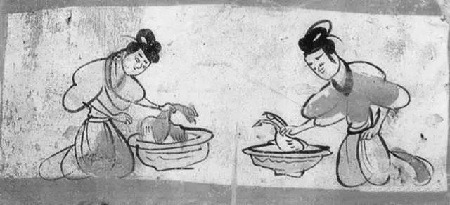 燙雞圖壁畫磚就出土于5號(hào)墓葬,這是繪制在一塊單塊磚面上的壁畫,磚面上用刷得甚薄的含膠白堊土作底,正中繪制二婢相對(duì)跪坐,袖子高高挽起,眉毛微撇,聚精會(huì)神地在各自的盆內(nèi)燙雞去毛。左邊盆內(nèi)雞有冠,為公雞形象;右邊盆內(nèi)雞無冠,似為母雞形象。用色較為單純,以墨、赭石和朱為主。畫面寥寥數(shù)筆,將婢女勞動(dòng)的情況表現(xiàn)得淋漓盡致,極具生活趣味。尤其是雞脖子被抓住的樣子非常傳神, 生動(dòng)地表現(xiàn)出寫實(shí)的情境。我們從中可以看到,1600多年前的人們殺雞處理食材,跟現(xiàn)在我們殺雞燙毛毫無二致。