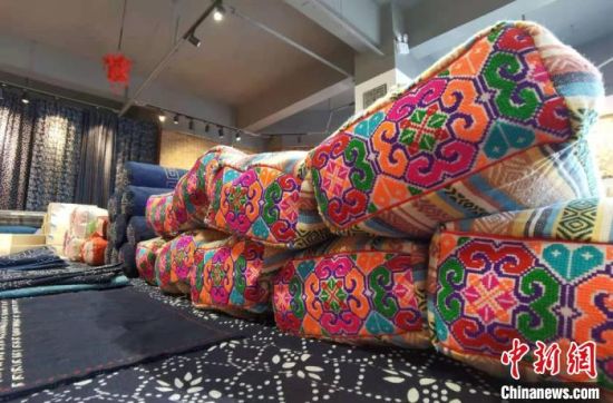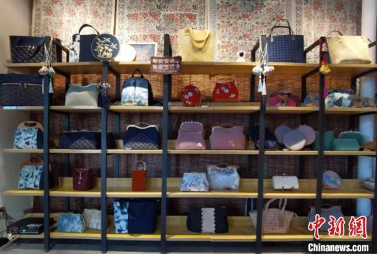 近日,中新網(wǎng)記者在安定區(qū)一家非遺工坊內見到祁輝,她身著正紅色漢服,腰間掛著香囊,穿梭于服飾區(qū)、布偶區(qū)和染布區(qū)之間。記者看到,工坊內展出商品種類多樣,色彩豐富,包括潮流挎包、時尚發(fā)卡、卡通布偶、可愛抱枕,以及扎染服裝和圍巾等,在極具古風創(chuàng)意的同時,還不乏國潮設計理念。