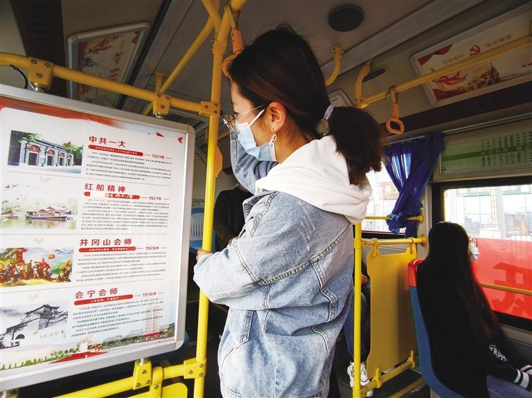 黨史學(xué)習(xí)教育主題車廂的車體外部掛有醒目的黨史宣傳標語,走進車廂,風道展板上以黨史故事的形式,圖文并茂、生動形象地展示著紅船精神、井岡山精神、長征精神、遵義會議精神、延安精神、西柏坡精神、抗美援朝精神、戰(zhàn)疫精神等內(nèi)容。車廂內(nèi)的座椅靠背、宣傳欄等處也印有不同的黨史宣傳知識,公交車廂成了黨史學(xué)習(xí)教育的流動“微課堂”。乘坐在黨史學(xué)習(xí)教育主題公交車上,乘客便可重溫中國共產(chǎn)黨波瀾壯闊的輝煌歷程,汲取民族復(fù)興的精神力量。