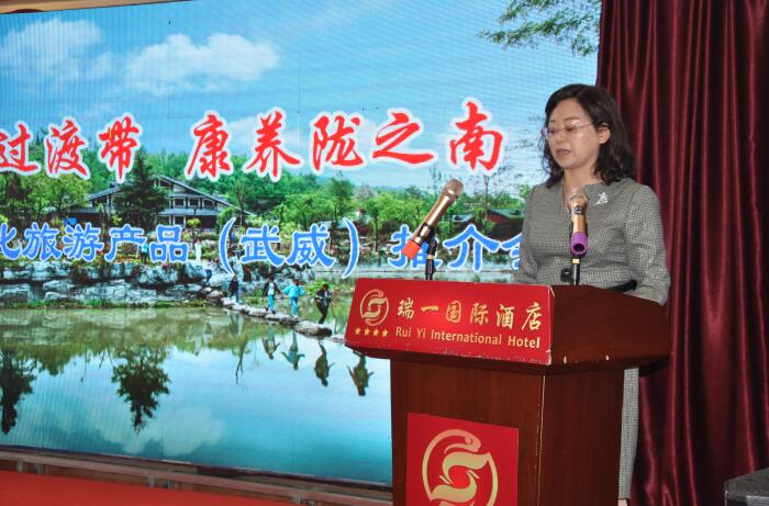 胡桂蕓在致辭中說,隴南和武威兩市文化旅游資源各具特色、互有優(yōu)勢,具有很強(qiáng)的差異性和互補(bǔ)性,隨著“一帶一路”建設(shè)的深入推進(jìn),兩地經(jīng)濟(jì)社會和文化旅游的交流將更加活躍。尤其是環(huán)西部火車游旅游專線列車的開通,更加拉近了兩地的時空距離,極大地方便了兩地游客的出行。通過今天的推介活動,我們希望參加會議的旅行社、自駕游俱樂部,多組織武威的游客來隴南觀光旅游、康養(yǎng)休閑。同時,也希望隴南的文旅部門及旅游景區(qū)、旅行社提供各種優(yōu)惠以及優(yōu)質(zhì)服務(wù),為促進(jìn)兩地文化旅游事業(yè)的合作共贏做出積極的貢獻(xiàn)。