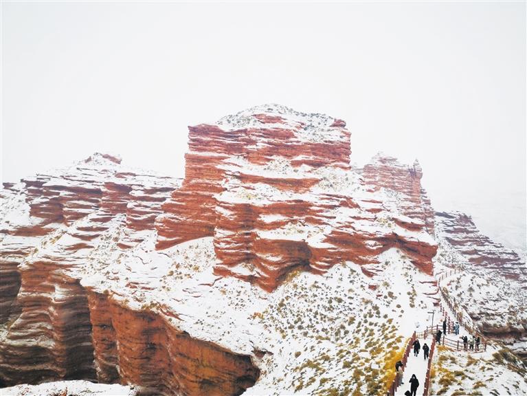 游客在景區(qū)觀景臺(tái)上伸手可觸摸到被白雪覆蓋的火紅色彩,峽谷內(nèi),山倚壁蜿蜒,峰隨地勢崢嶸,石林犬牙交錯(cuò),游客不時(shí)發(fā)出由衷的贊嘆,眼前的風(fēng)光如仙境一般。