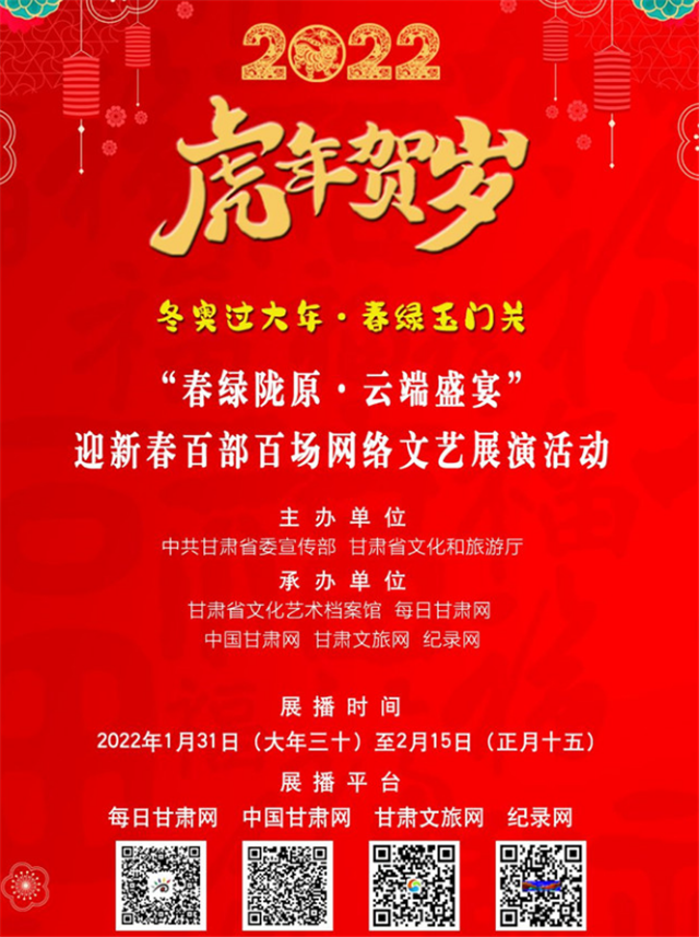甘肅省博物館在春節(jié)期間舉辦了“虎虎生福——壬寅(虎年)新春生肖文物聯(lián)展”,甘肅省圖書館舉辦7大專題30余項(xiàng)文化體驗(yàn)活動(dòng)。在“春之華章”2022年甘肅省電視春節(jié)聯(lián)歡晚會(huì)上,原創(chuàng)話劇《八步沙》、隴劇《大禹治水》等精彩上演;甘肅省非遺保護(hù)中心開(kāi)展了“虎虎有神過(guò)大年——如意甘肅·多彩非遺”宣傳推廣活動(dòng);甘肅演藝集團(tuán)通過(guò)線上線下結(jié)合方式,開(kāi)展2022“我們的中國(guó)夢(mèng)”——文化進(jìn)萬(wàn)家迎新春文藝演出活動(dòng);張掖市舉辦春節(jié)“九曲黃河燈陣啟燈納福非遺文化展演”活動(dòng)。