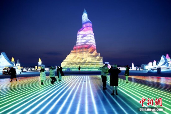 2月21日,游客在3D感應(yīng)冰面上拍照。連日來,冰雪大世界的客流量迎來小高峰,單日客流量可達(dá)四五千人。 中新社記者 姜輝 攝