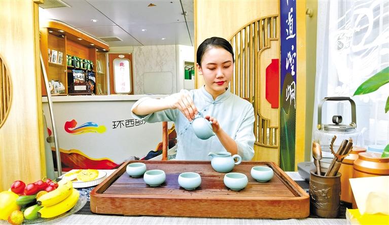 這趟列車由6節(jié)軟臥車廂、1節(jié)餐車、1節(jié)休閑娛樂功能車組成,車體內(nèi)外隨處可見平?jīng)鑫幕糜卧亍S浾咴谲噹麅?nèi)看到,崇信龍泉寺、華亭安口窯古村落、靜寧仙人峽……每一間軟臥門上都是絕美的平?jīng)鲲L(fēng)光大片,整個車體儼然移動的“平?jīng)鑫穆谜桂^”,讓人“身未動,心已遠(yuǎn)”。車體中部的功能車,更是顛覆了以往人們對火車的認(rèn)知,麻將桌、功夫茶、全套的K歌設(shè)備,還有平?jīng)鎏厣穆蒙唐?、農(nóng)特產(chǎn)品展銷區(qū),平?jīng)鑫穆脮営[區(qū)、平?jīng)鑫幕黝}報(bào)刊欄,足以打發(fā)游客在旅途中的無聊時(shí)光。餐車也極富特色,車廂頂部裝飾有色彩豐富的藻井圖案,飛天仙子衣袂飄飄、環(huán)繞四周。“在這樣的餐車上吃飯,吃的那是品位。”一位乘客開心地和同行的伙伴說著。62歲的張女士一到平?jīng)鼍兔Σ坏亟o女兒發(fā)微信,“火車上住得舒適,服務(wù)好,環(huán)西部火車游·崆峒號很超值!”