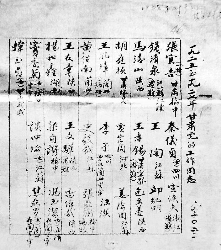 1925年-1927年甘肅黨組織成立初期的黨員名單,其中女黨員有秦儀貞、竇香菊、談仲瑜、韓玉貞等。