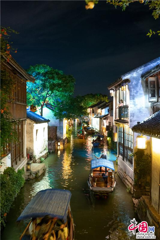 宋朝時候,宵禁解除,每至深夜,燈火通明。如今周莊的夜色,亦是在光影中沉醉,水影搖曳間,畫船枕眠。這里,可以陽春白雪,不食煙火;也可以徹夜不歇,最懂人間。這場周莊的溫柔夢,將一直編織下去……澤國溫柔的清風,夜間可愛的彎月,若能與你共賞,那便再無遺憾。歌里唱,不懼怕,天涯路長,甘為你,披滿身風霜,請君,入夢。(尤紫璇 周宣)