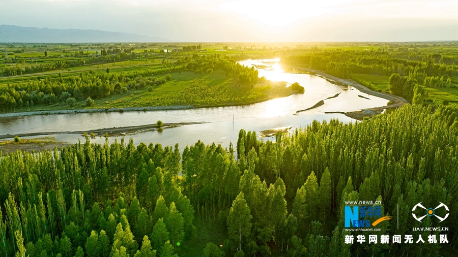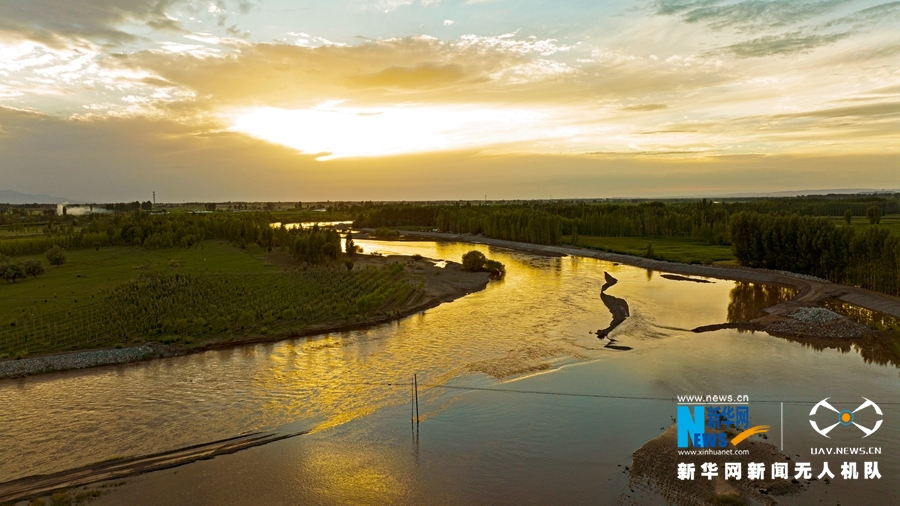 這是7月17日在甘肅省張掖市航拍的黑河晚照。新華網(wǎng)發(fā) (成林 攝)