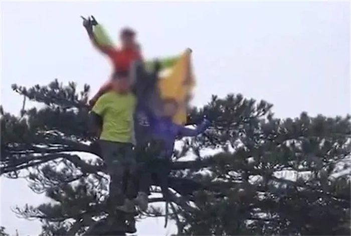 安徽宣城某景區(qū),游客爬到景區(qū)古松頂拍照