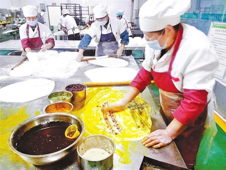 “揉面、搟面、抹餡料……”手工制作線上一位大姐告訴記者:“目前我們有手工生產和全自動生產兩條線,分別生產千層餅傳統(tǒng)面點和玫瑰餅等新型糕點。傳承祖上燒餅制作技藝,工人們要在前一晚和好面,面團經過一夜的醒發(fā)后,天剛亮再交由經驗老到的師傅打堿,揉面、搟面,涂抹苦水玫瑰醬、胡麻顆粒、香豆粉、姜黃粉等餡料,卷制成型,在千層餅正面撒上芝麻,就可以上烤箱了,大約每天上午10點前烘烤好的千層餅會送往永登各銷售點。”